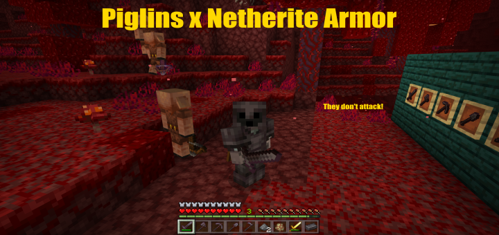 Sick of wearing that golden helmet when going to the nether when you could be wearing netherite? Well, this addon changes that by making Piglins not get aggressive when you wear netherite armor!