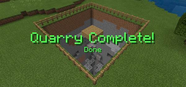Quarries you create will replace stone, dirt, granite, and etc. with air but they will leave all ores for you to mine. Quarries are 6×6×70 blocks in size! They also generate a wooden fence as well give you some scaffolding and an iron pickaxe to move up and down and mine with. On some older devices quarry generation can take up to 30 seconds.