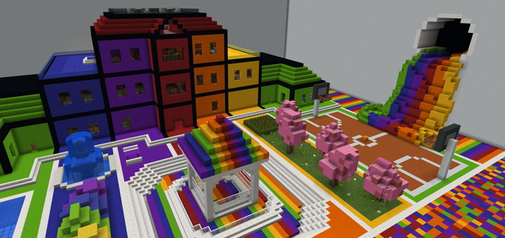 This map features a big, colorful and rainbow themed high school. There are plenty of different rooms, a basketball court and even a swimming pool. The idea with the colors is to make the school more interesting and less dull and boring. Included in the map are also a rainbow elytra add-on and mega rainbow enchant add-on to add even more rainbow effect.