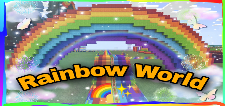 It is a rainbow world that is filled up with many different rainbow buildings that I had installed it from an app which called “minecraft buildings”. You can discover the world using minecart or walking. I hope you enjoy discovering this world.