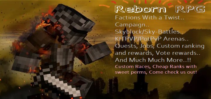 Reborn RPG <-- (Server Page – click! ^-^ ) is a server for those looking to take their RPG Minecrafting, To the next level, It is like factions, BUT WITH A TWIST….. (Blood Effects upon character hit, over 100+ Custom Enchantments and Special Abilities. Our factions server has Other mini games within it, I.E Dragons! BUT, The main game will be the RPG Factions which has active hosts! Custom Enchants! Player Customization! Your experience within our server will be exactly what you’re looking for if its ANYTHING within the PvP AND “RPG GAMES” Aspects of Survival! (the game.. skyrim for example….!!! )