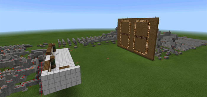 This is a fully functional redstone calculator which can perform the basic process of addition on two numbers and then printing the result on a screen made out of wooden blocks and glowstones. It’s a great map to demonstrate the possibilities redstone provide in the latest version (0.13.0) of Minecraft Pocket Edition.
