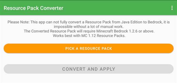 With this app you can convert Minecraft: Java Edition Resource Packs automatically into resource packs for Minecraft: Bedrock Edition extremely easily! All you need to do is to pick the zip file containing the resource pack and then just hit the Convert and Apply option. After the loading process is done just hop into Minecraft and enable the resource pack!