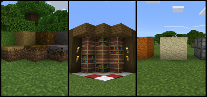 This add on adds new blocks that uses default Minecraft textures. It adds 8 new blocks to the game from a grass block that had the same texture at all sides to a reused loom texture to create a shelf.