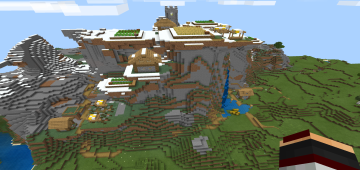 This seed looks normal at spawn until you see the village on a giant mountain. Some houses are where they should be, but most are hanging off a ledge. The Mountains around it are being destroyed by caves.