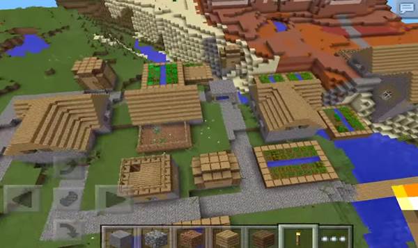 In this seed you will spawn in a village where one part of the village is generated in a mesa biome and the other majority part in a plains biome. The village is fairly small with no blacksmith but many houses and farms.