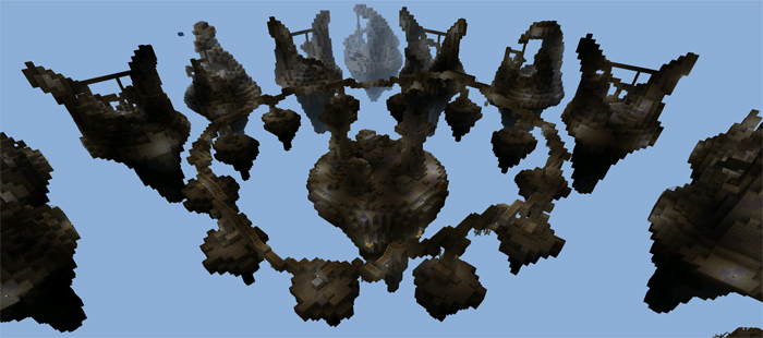 Sky Mines is a PvP map for up to sixteen players (4 players per team). In total there are 17 main floating islands and 12 mini islands connected by rails. The main islands (also known as the larger ones) can only be reached by first crafting the necessary blocks, e.g. rails, and placing them to get there.