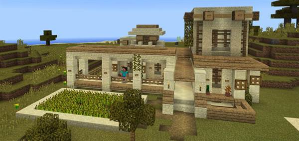 This creation features a really nice looking house built in a savannah biome which could serve as a great outpost for your next adventure. Inside the house you’ll find some basic furniture and some levers. You can use the levers to access an entrance to the basement. Down there you will find a huge farm which is fully automated by redstone.
