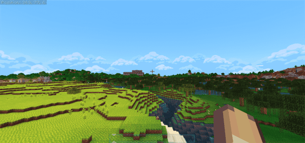Immediately after spawning into the world, you are greeted by the woodland mansion and a village next to it. Behind the mansion, is an outpost, and a bit further down is a ravine and another village.