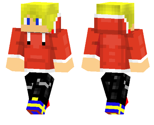 red hoodie, black sweatpants, sweden shoes, blonde hair, blue eyes.