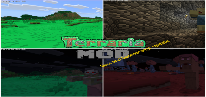 Like Terraria? Think Minecraft could use some of Terraria’s ores, tools, weapons, enemies, bosses, and biomes? Try the Terraria Mod it adds lots of Terrarias features, and my goal is to soon have add all of Terrraria’s content into Minecraft! Fight the Eye of Cthulu, dig for rare ores, explore the dangerous Crimson biome, and much more!