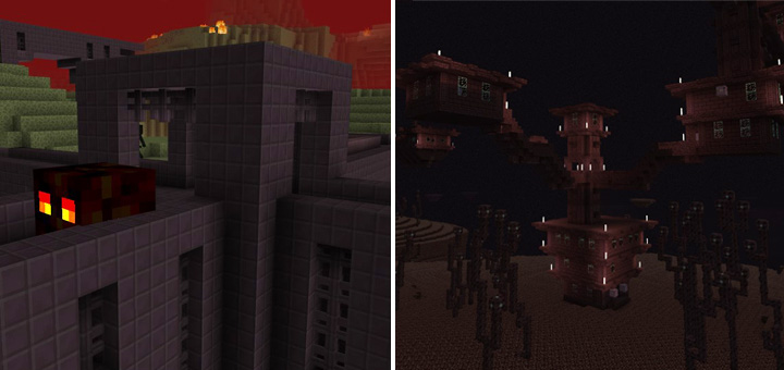 The Nether also looks kind of cool but personally I think it looks a little bit out of place. Mostly so because the sky is red and doesn’t blend well with the purple stone and beige ground.