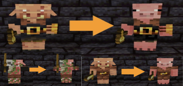Do you like the outfits of the piglins but prefer the classic Pigmen? Well look no further this texture pack changes Piglins to Pigmen while keeping their outfits the same.