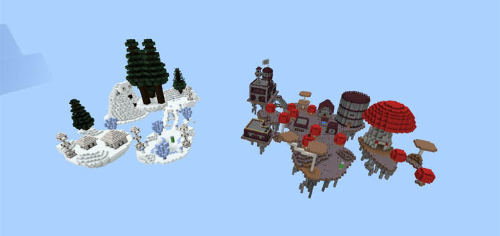 Tiny Continents consists of eight skyblock islands. Your objective is to survive and try to find enough resources to be able to explore all eight islands and then ultimately go to the Nether to complete the map challenge. Each skyblock island is like a separate biome but they all have unique structures which look really exciting to explore.