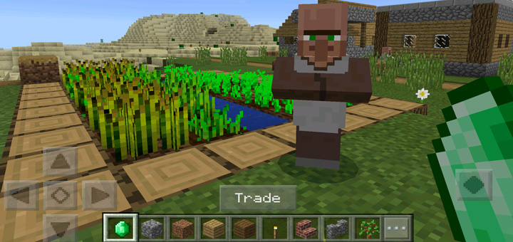 To trade with a villager you will need an emerald. Hold it in your hand and then long-tap on a villager. It’s important that you quickly press the Trade button otherwise it’s a possibility that the villager might run away.