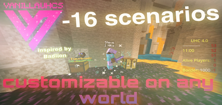 Bringing the world uhcs on the next level with this add-on. Up to 50 players can enjoy this uhc with scattering, moving border, spectatesystem etc. and creating your custom game with own decisions about configs (when the border shrinks e. g.), teamsize, scenarios and extra settings.