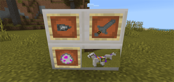 This Addon has a sword that gives buffs and unicorns that replaces the mule. There is another item called the Unicorn Horn Shard too which is used to craft the sword.